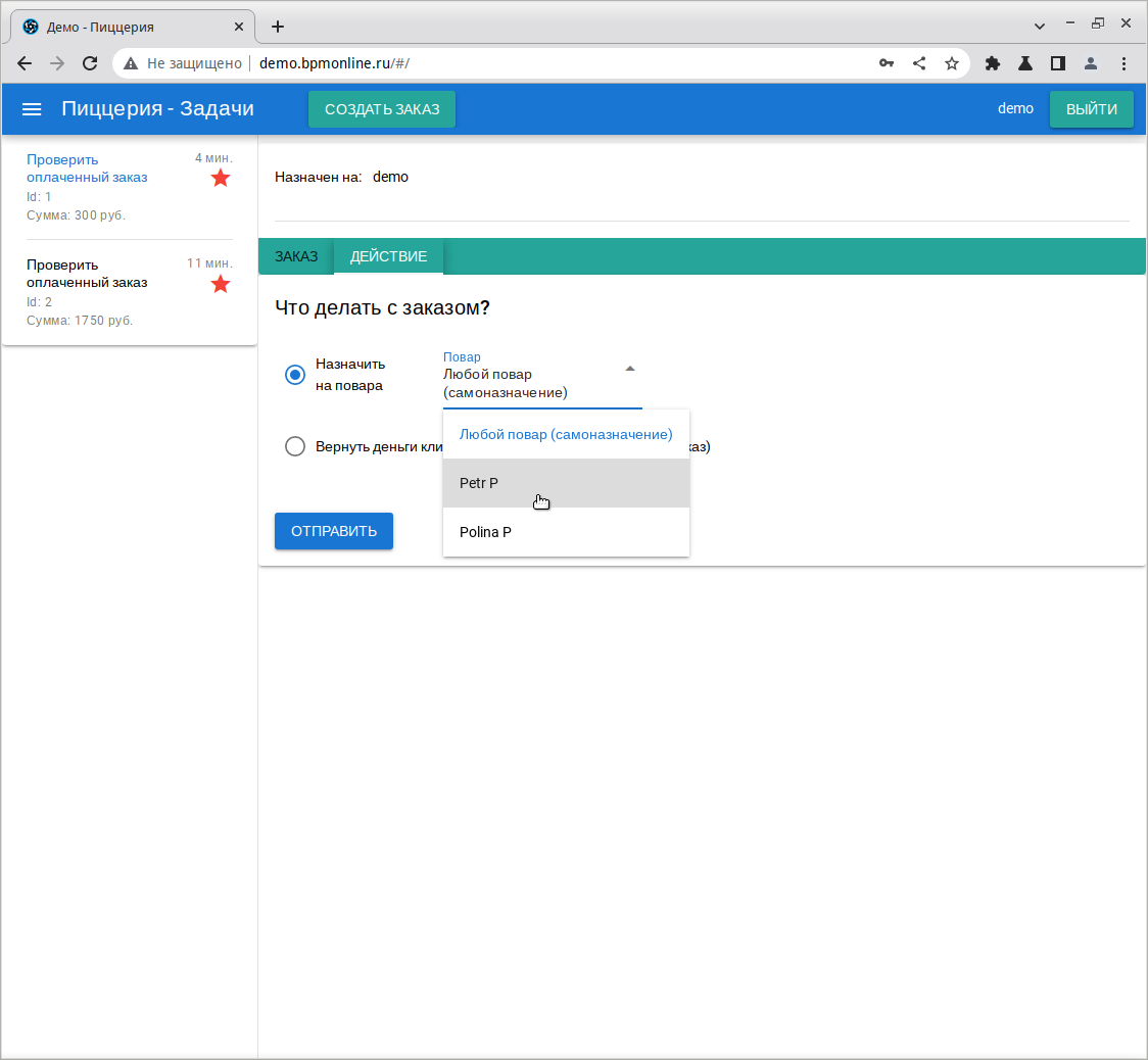 По завершении приготовления пиццы повар возвращает заказ менеджеру, чтобы тот выбрал курьера для доставки. Курьер доставляет заказ и все счастливы.